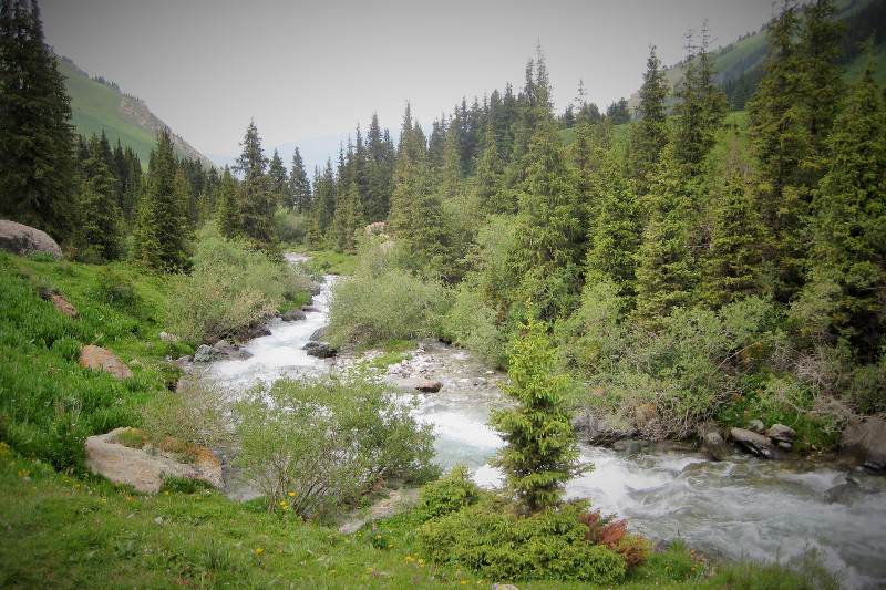 The trail climbs steadily, but is not too steep. There are many beautiful picnic spots along the trail, and you're never far from the river. This easy day hike goes directly into the mountains from the village of Birinchi Mai (May Day). It's a beautiful hike that passes many yurt camps, where local families stay for the summer while their animals are in the high pastures. If you're lucky, you may be invited into one of their yurts for a cup of tea or a glass of kumiss. The route starts a few kilometers outside of Birinchi Mai, but its certainly possible to hike directly from the village. The path continues much farther into the mountains too, so this could be made into a multi-day trek.